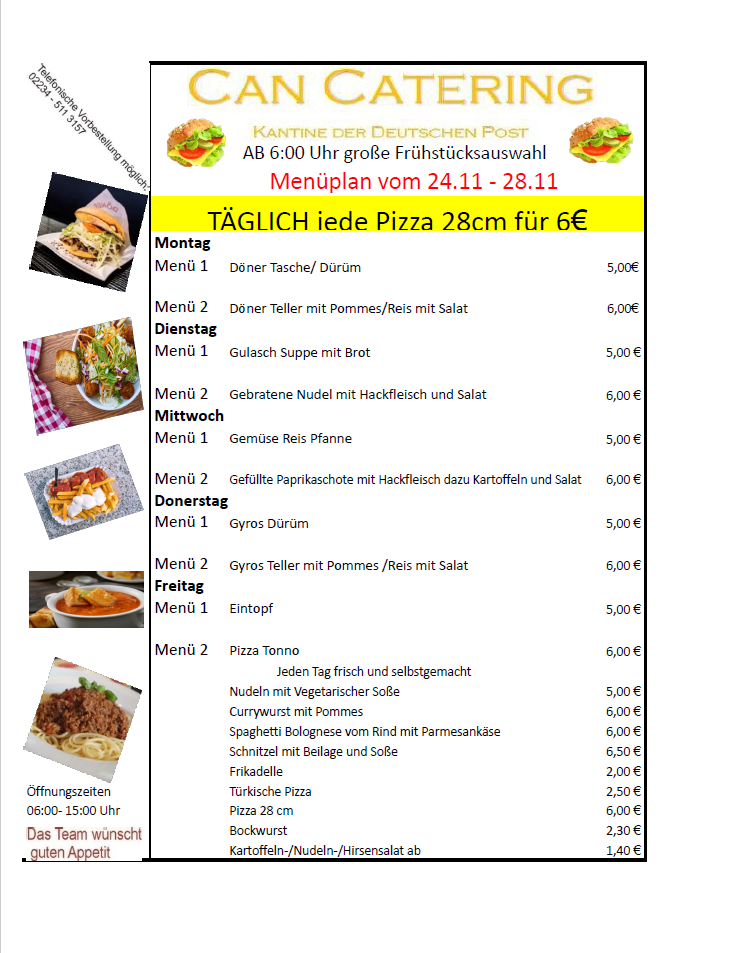 Menüplan der Kantine >>> DOWNLOAD Menüplan vom 24.11 – 28.11 <<< Gerne schicken wir Ihnen unseren Menüplan wöchentlich per Email zu! Schreiben Sie uns einfach dafür über das Kontaktformular oder per Email an info@cancatering.de eine Nachricht! Dein Name (Pflichtfeld) Deine E-Mail-Adresse (Pflichtfeld) Betreff Deine Nachricht